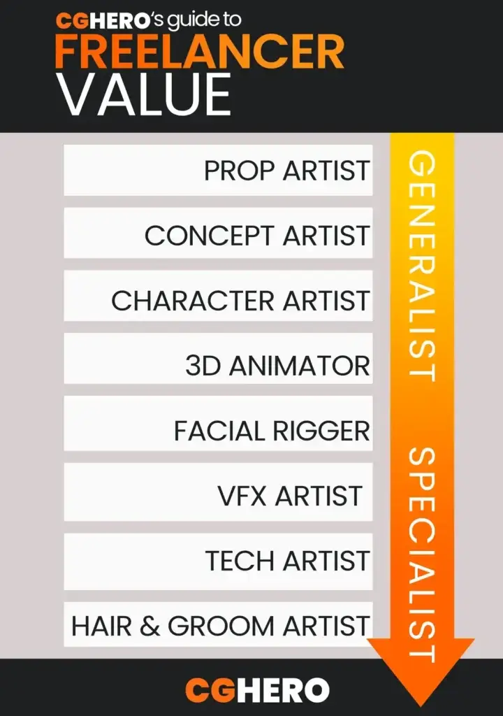 This is a non exhaustive list, but consider how applicable your skillset is; if you consider yourself a prop artist, then you also an environment artist. Skills in this realm can expand into optimisation, UV unwrapping and texturing and sculpting. However, a hair or groom artist’s skills are generally only applicable to creatures, characters and animals, for example. See below for a rough scale of freelancer value in the games and media industries.
