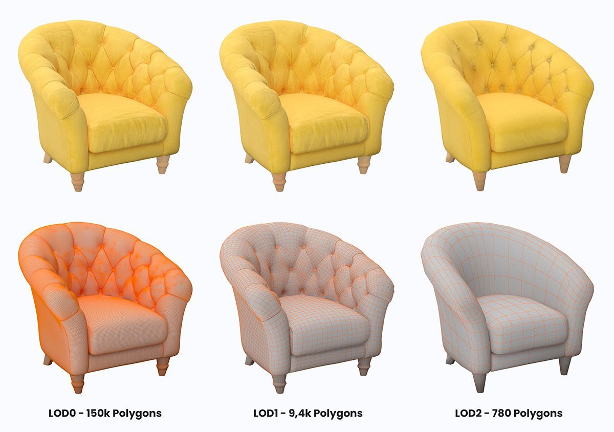 Once the sculpt of the chair was produced, the artist would create multiple versions of the model with different levels of detail (LODs) usingretopologymethods. The highest fidelity model would primarily be used for photorealistic visualisations such as Film and Video Game Cinematics whereas the lower fidelity models would be used more within Video Games, and 3D web viewers.