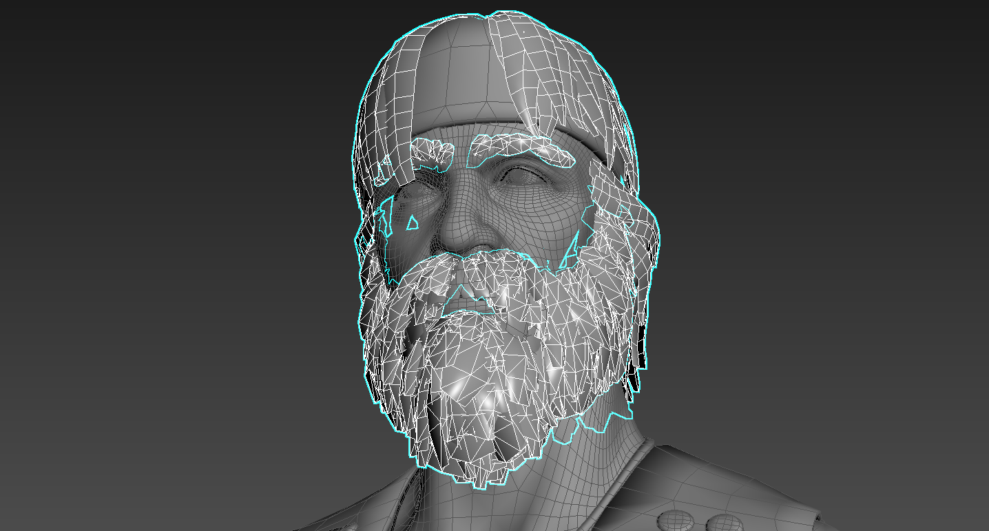 Once the hair cards are created, the artist carefully places them into position ensuring that there is no obvious repetition, resulting in unique looking hair strands. The hair and beard came to 9.6 triangles. To learn more about creating and placing hair cards, check out this tutorial on creatingHair Cards.