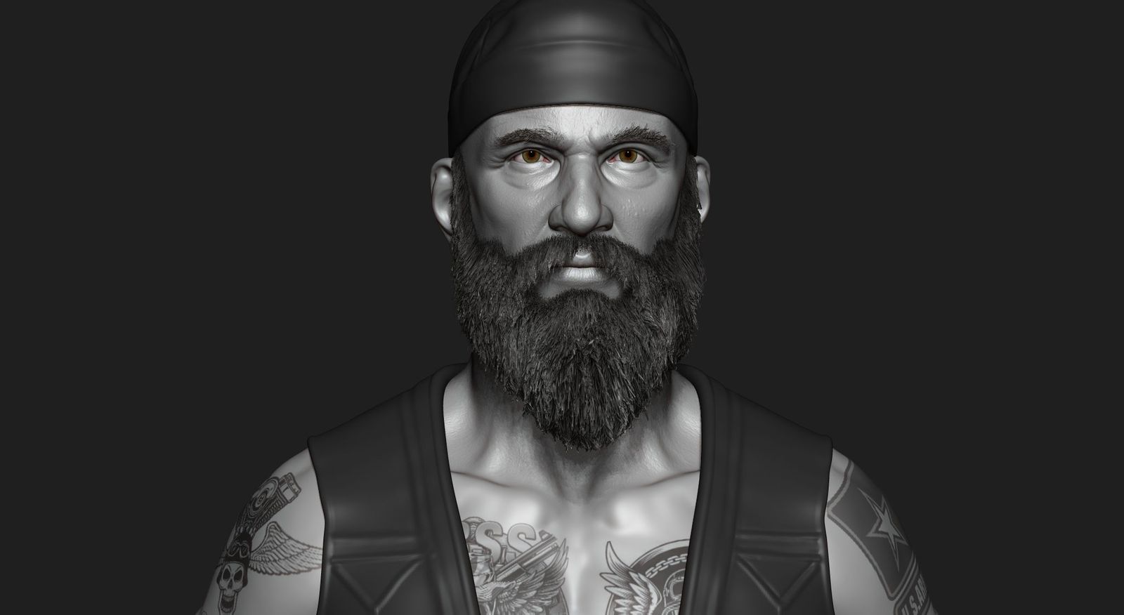 The artist usedZBrushfor this character. They would start with a base mesh or they would block out the characters basic form using digital clay. Once the general proportions of the model were created, the next level of detail was added like bone structure, muscles, and limbs. After this, the finer details like winks, scars, etc are added.
