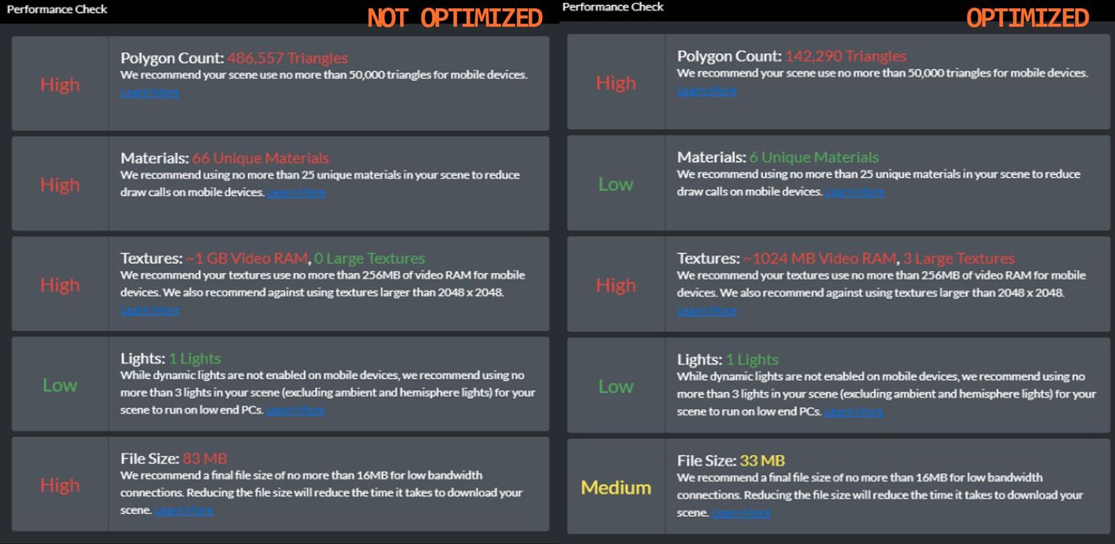 Here are the performance statistics for before and after the optimisation. This work enabled the room to be viewed on mobile phones, as the original scan would not.