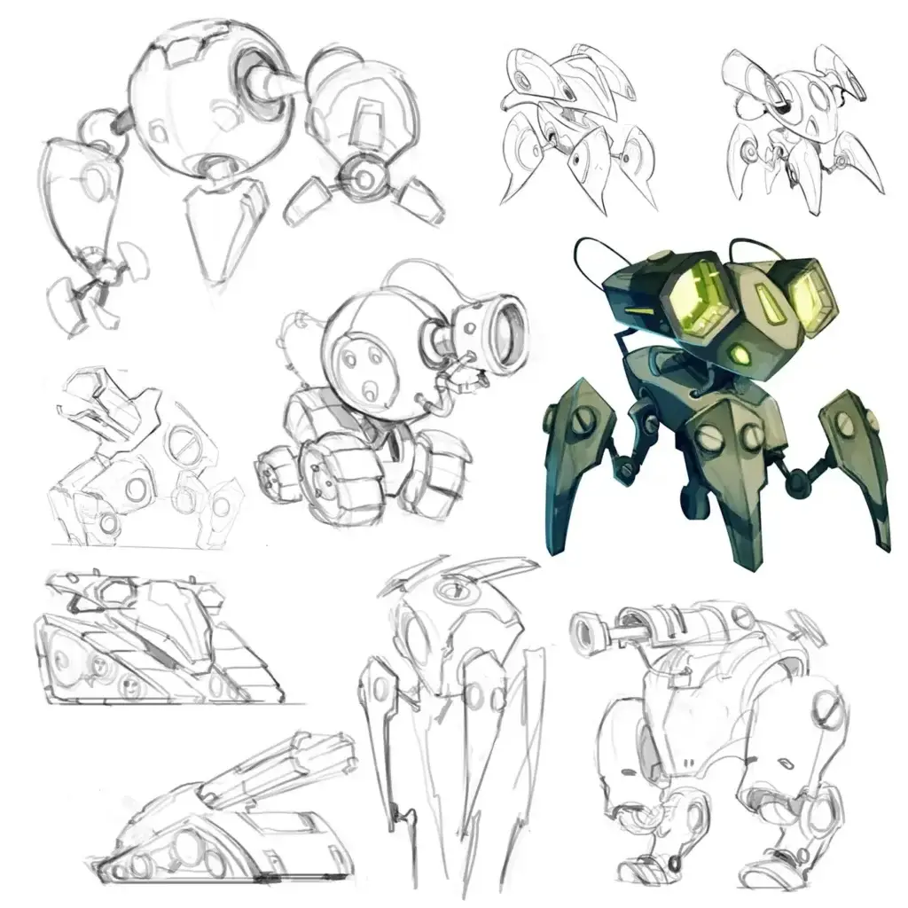 The concept art stages are quite fluid and vary from person to person, studio to studio. However, they typically start out with various Thumbnails and then move forward with a few into Initial Line Drawings. The level of detail increases with each stage as you move forward until you arrive at the Final Concept Art.