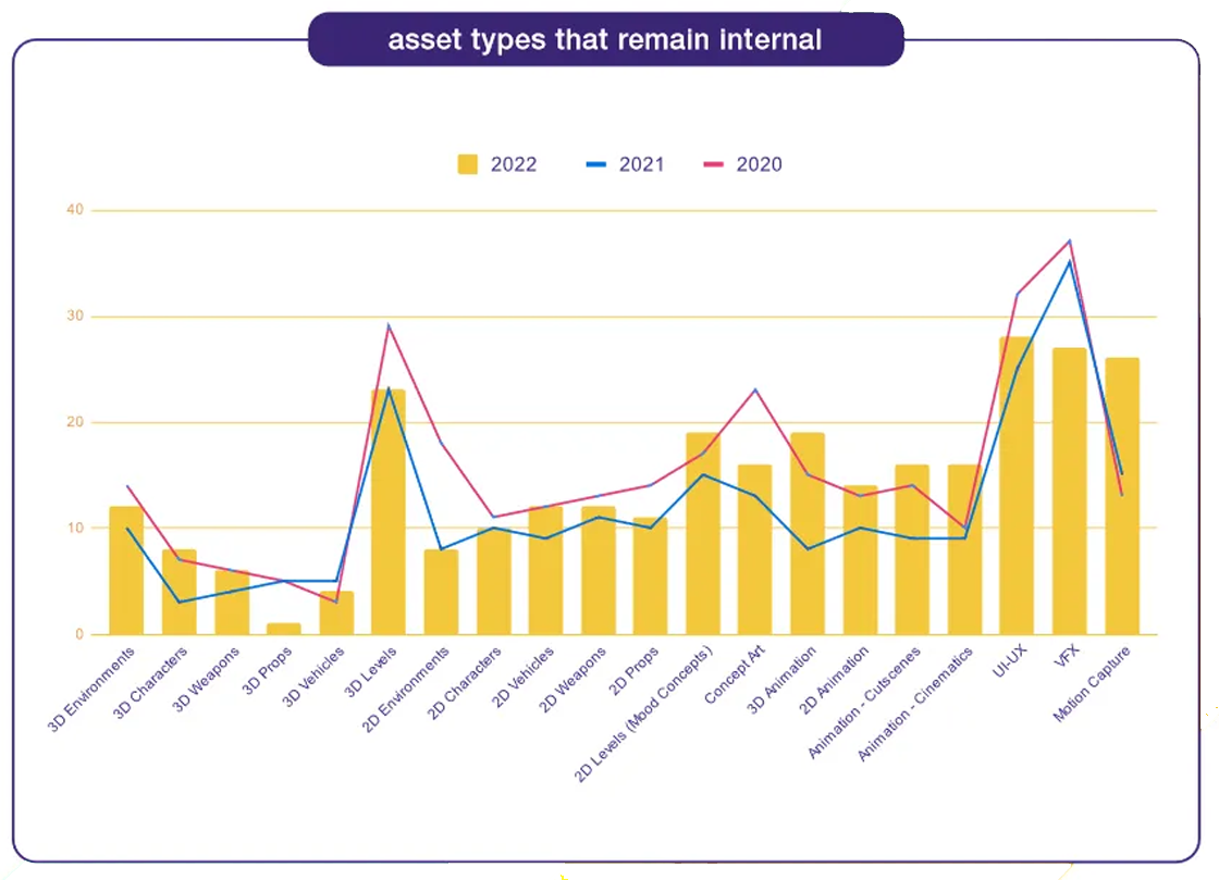 The latter has seen some turbulence in recent years - in 2020, concept art was at an all time high, with nearly 25% of all concept assets being completed in-house. In 2021, reflecting the work from home revolution, concept art production was dominantly outsourced; this year, however, concept art has seen a rise in internal production. This could be due to a lack of freelance concept artists, or because of a preference for permanent employees in concept art due to the rigorous iterative cycle of creating artwork.