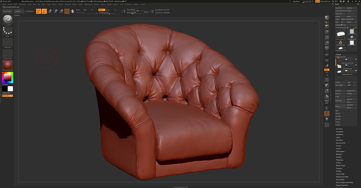 The model was originally sculpted inZbrushto ensure that all a high level of detail was captured ready to be baked down into the optimised versions of the armchair. The process started with a ball of clay which was pushed and pulled around to mould different shapes and adding fine surface detail.