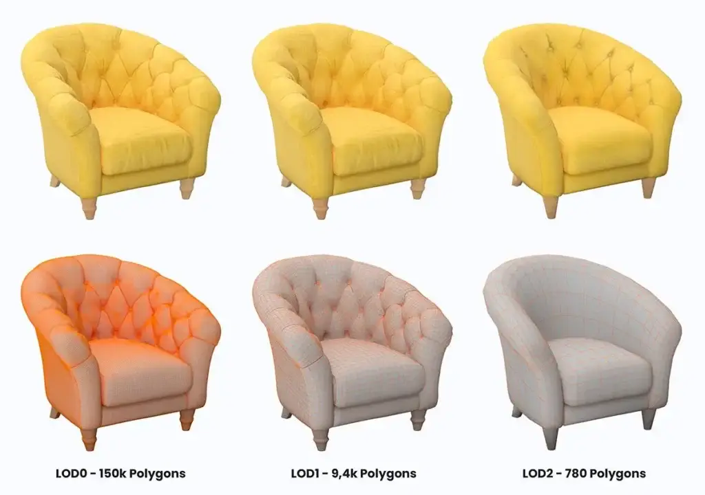 Once the sculpt of the chair was produced, the artist would create multiple versions of the model with different levels of detail (LODs) using retopology methods. The highest fidelity model would primarily be used for photorealistic visualisations such as Film and Video Game Cinematics whereas the lower fidelity models would be used more within Video Games, and 3D web viewers.