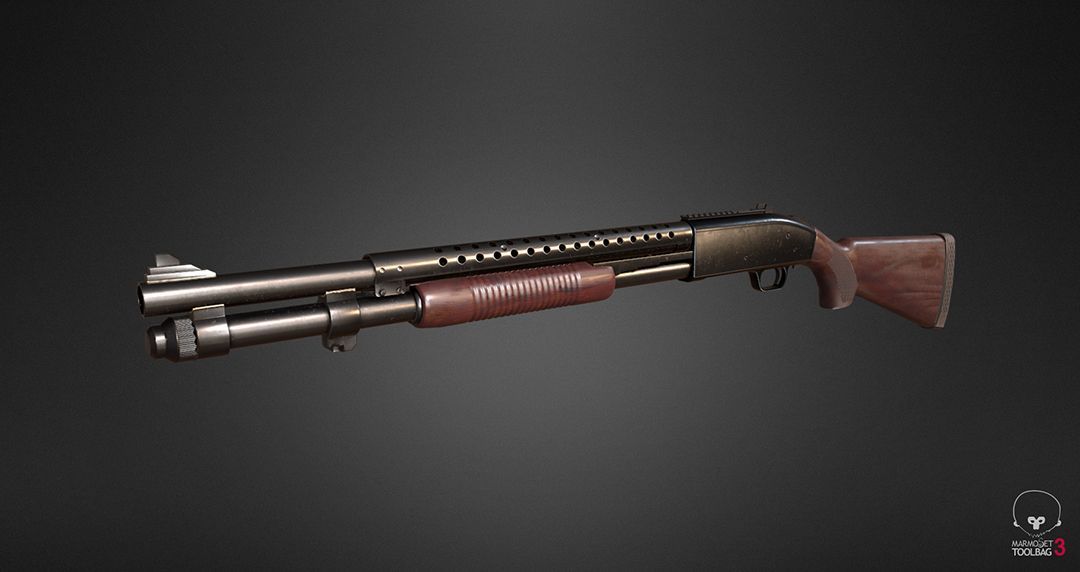 Below is a shotgun which was textured using Substance Painter using a Metallic/Roughness PBR workflow and rendered with Marmoset Toolbag.