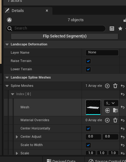 Once you’re happy with your Spline, select one of the small Spline icons (they look like little mountains). Under Details, nect to Select all connected, select Segments. Then, under Landscape Spline Meshes, go to Spline Meshes and add an Array Element. Select the Snow Road you imported earlier.
