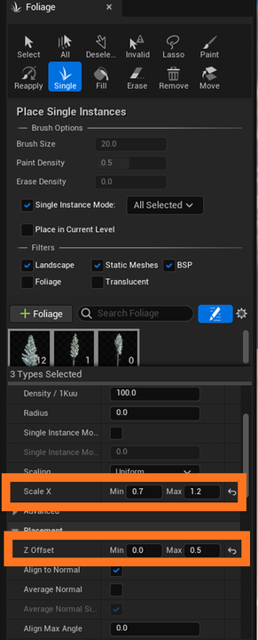 At the top of the foliage tab, select “Single”, and begin placing trees! This is a simple point-and-click method in the editor. You can change which tree by deselecting it in the foliage mode tab.